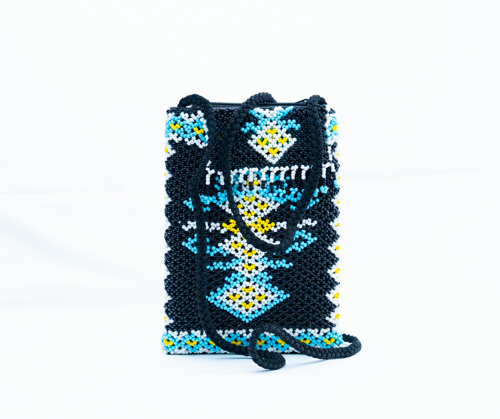 幾何学模様に配置された美しいビーズワークが特徴で、ターコイズ、ブラック、イエローの配色がアジアンテイストを引き立てます。コンパクトな縦型設計で、カード、小銭、リップなどの小物入れやカードケースとして活躍します。