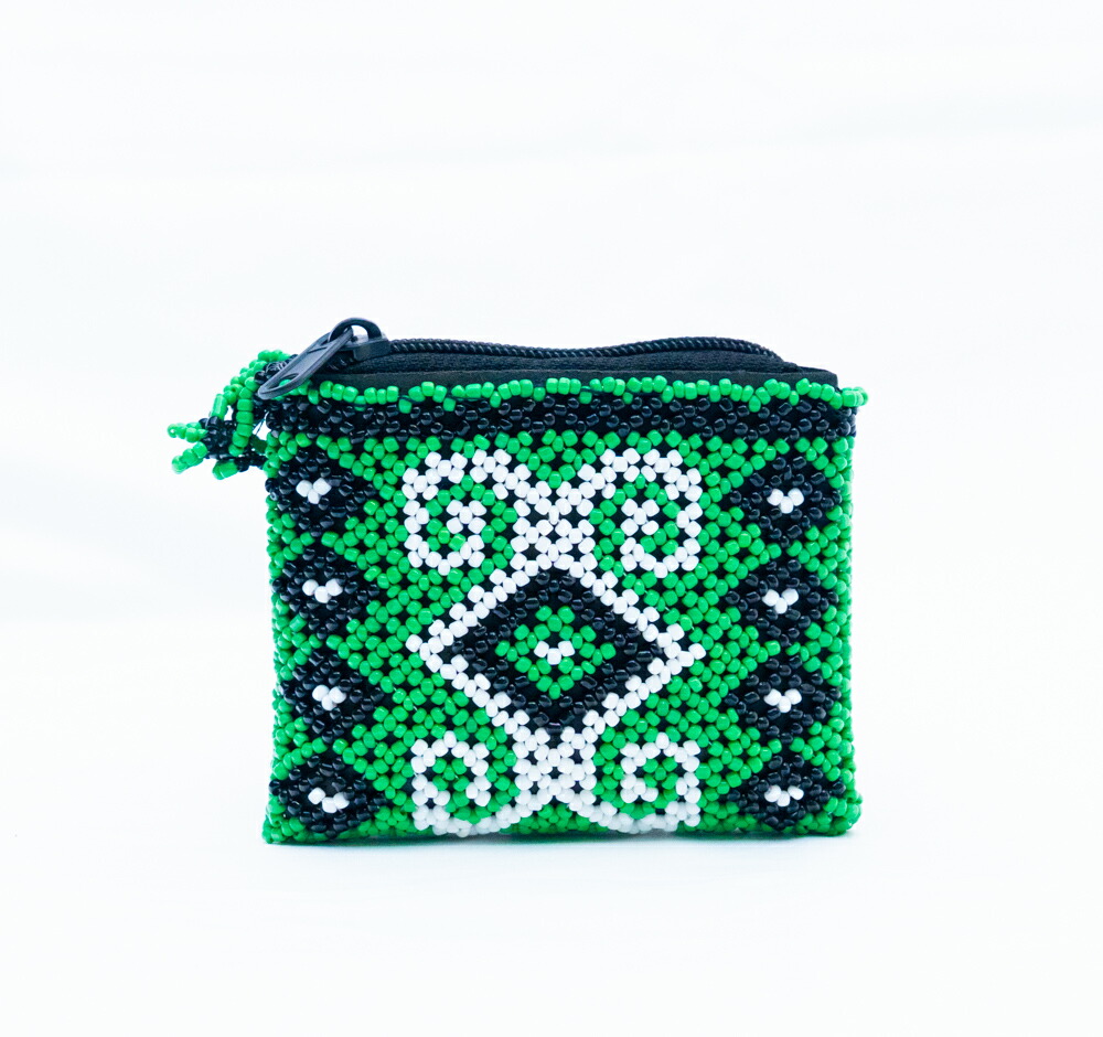【伝統工芸】インドネシア ダヤック 総ビーズ ミニポーチ グリーン 緑 スクエア型 幾何学模様 エスニック アジアン雑貨 小物入れ コインケース アクセサリーケース ハンドメイド 一点もの ギフト 贈り物 芸術品