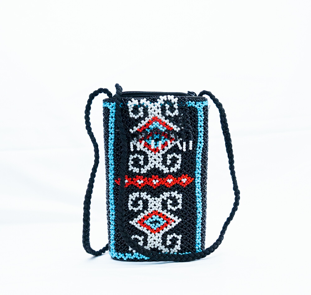 色鮮やかなビーズを使った幾何学模様が特徴で、ブラック・ブルー・レッドなど個性的なカラーバリエーション。すべて職人による手作りのため、1点ものの独特の表情を持っています。