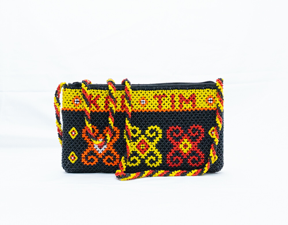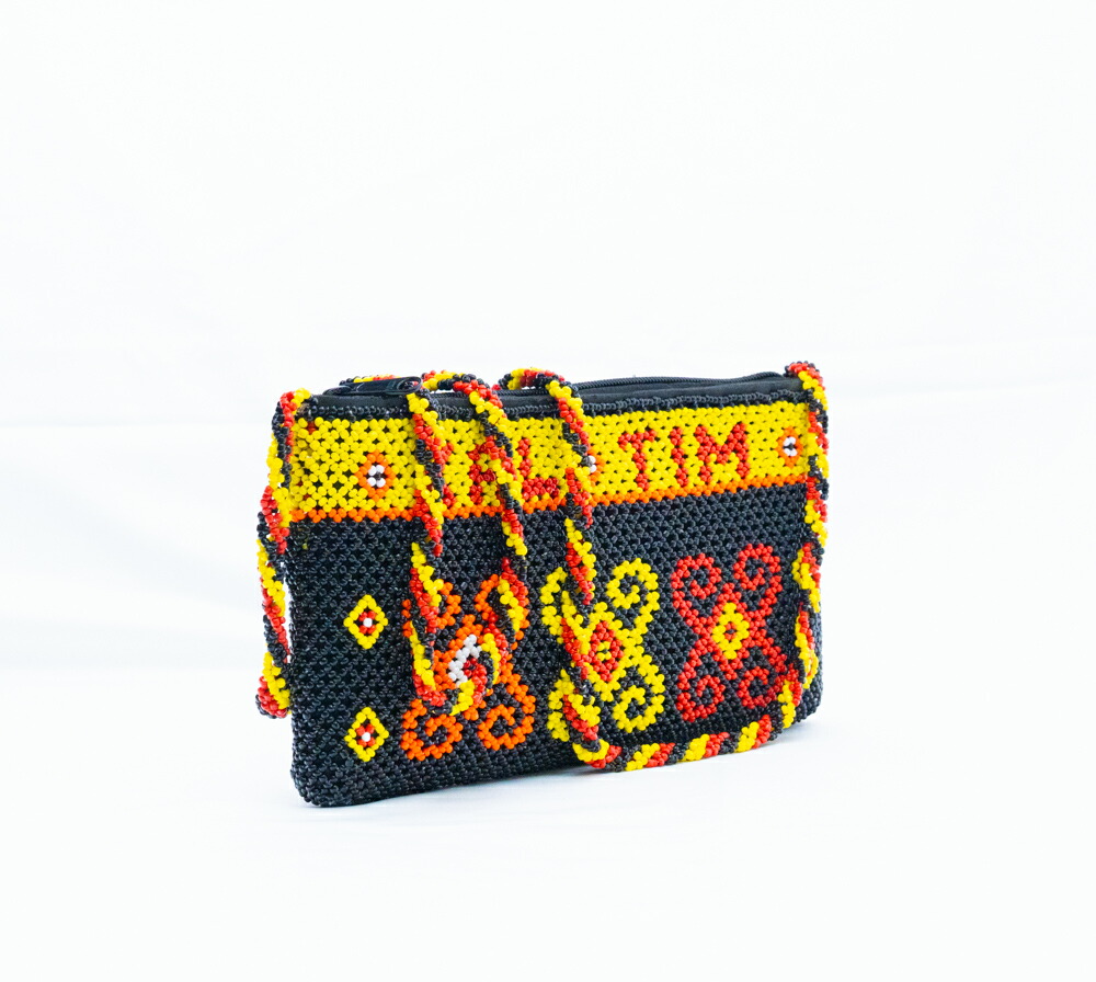 【本場 KAL TIM 刻印】インドネシア ダヤック 総ビーズ ショルダーバッグ ポシェット スマホショルダー 伝統工芸 東カリマンタン 民族柄 エスニック アジアン雑貨 幾何学模様 イエロー ブラック レッド 1点もの ハンドメイド ギフト