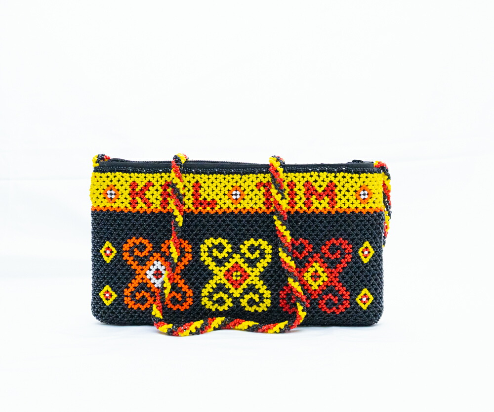 インドネシア東カリマンタンの先住民族ダヤック人による本格的なビーズ刻繍バッグです。幾何学模様が美しく織りなす総ビーズ仕立てで、イエロー・ブラック・レッドの民族色が鮮やかに輝きます。