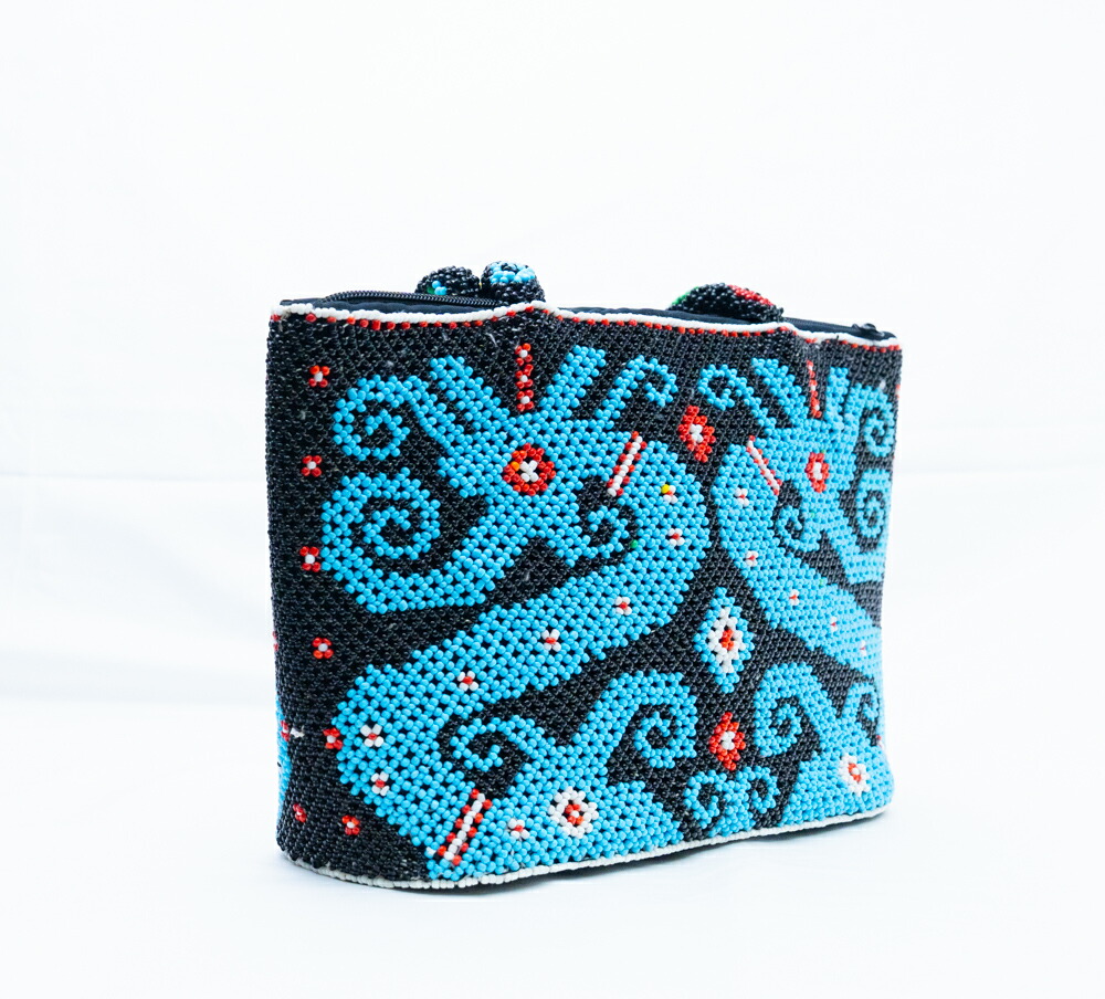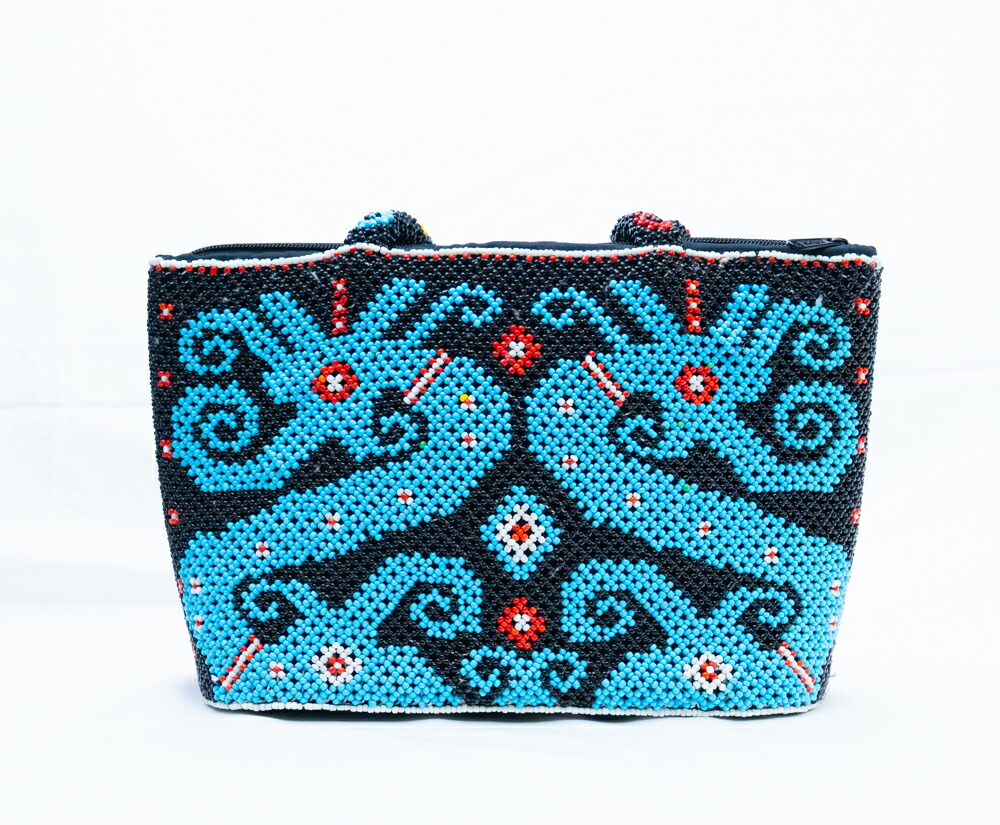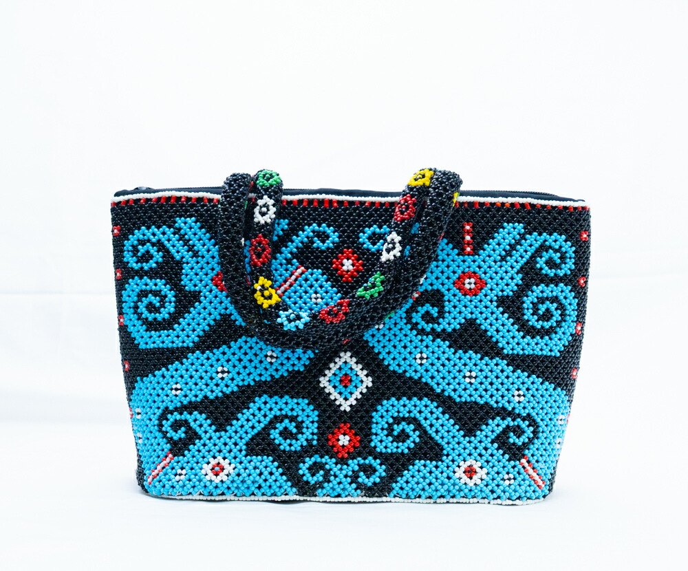 【極上手仕事】インドネシア ダヤック 総ビーズバッグ ハンドバッグ ターコイズブルー ブラック 民族柄 エスニック アジアン雑貨 幾何学模様 個性的 一点もの ハンドメイド ギフト 贈り物 華やか ファスナー付き