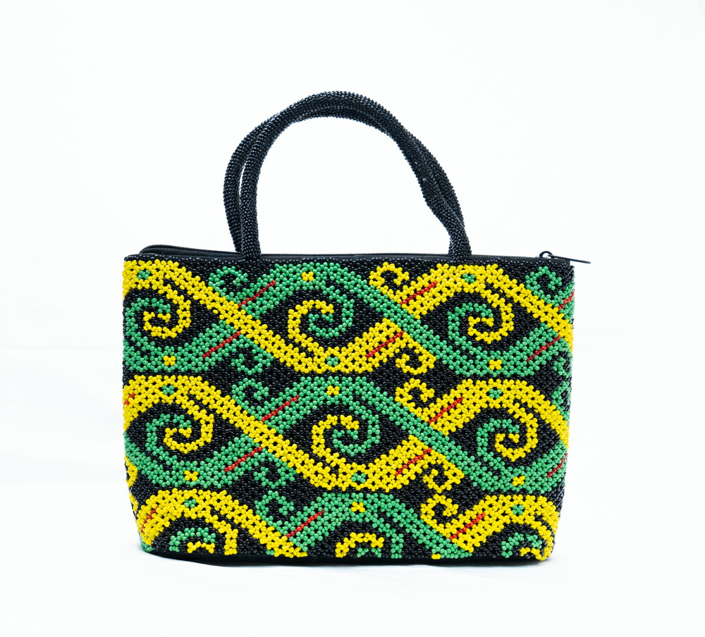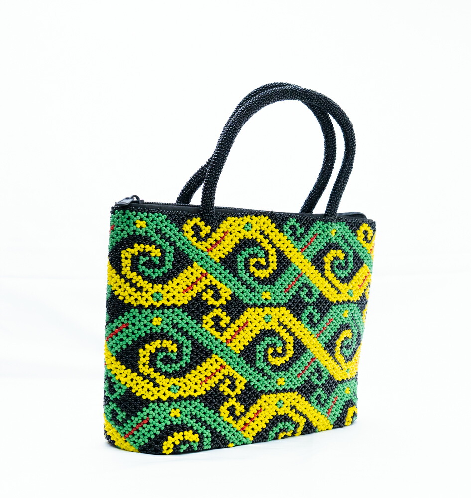 【伝統工芸】インドネシア ダヤック 総ビーズバッグ ハンドバッグ 総ビーズ 民族柄 グリーン イエロー ブラック エスニック アジアン雑貨 幾何学模様 個性的 一点もの ハンドメイド ギフト 贈り物 華やか ファスナー付き