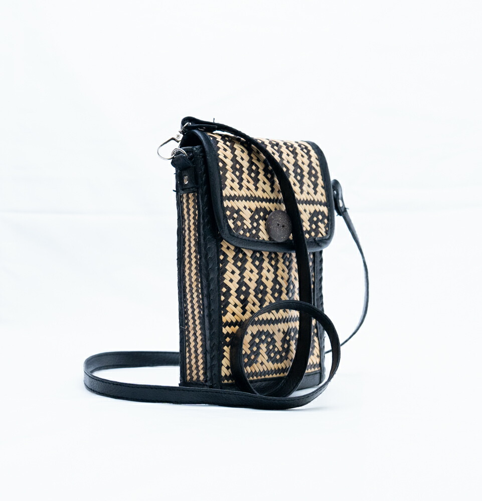 【トレンドのスマホショルダー】インドネシア 伝統工芸 手編み ラタン スマホポーチ ショルダーバッグ 縦型 ブラック 民族柄 エスニック アジアン雑貨 幾何学模様 シック 大人カジュアル 1点もの ギフト 贈り物