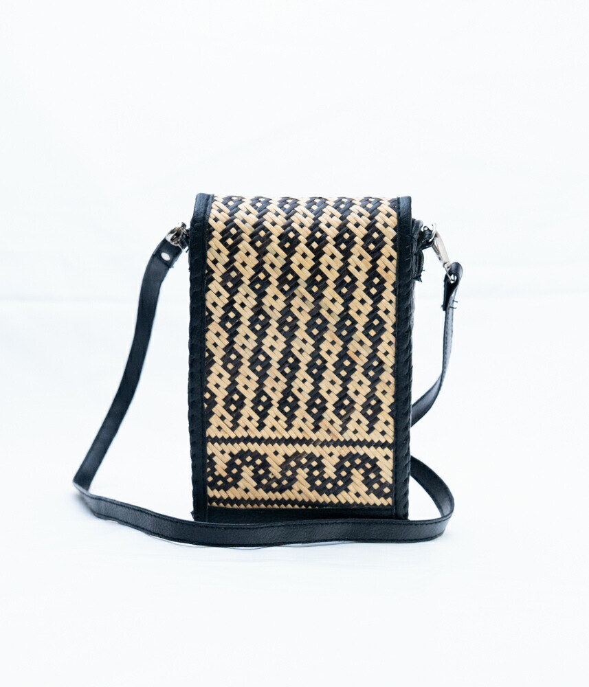 インドネシアの伝統工芸を活かした、職人による手編みラタン製スマホショルダーバッグです。幾何学模様の民族柄とブラックカラーが絶妙に調和し、大人カジュアルなスタイリングを演出します。