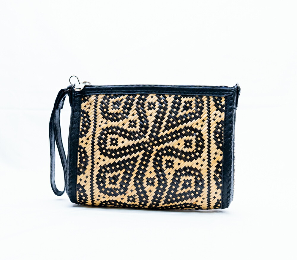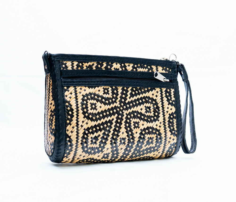 【機能美】インドネシア 手編み ラタン ポーチ クラッチバッグ フロントポケット付 YKKファスナー 伝統工芸 ダヤック 幾何学模様 セカンドバッグ 小物入れ スマホポーチ ブラック シック 1点もの ハンドメイド ギフト 贈り物