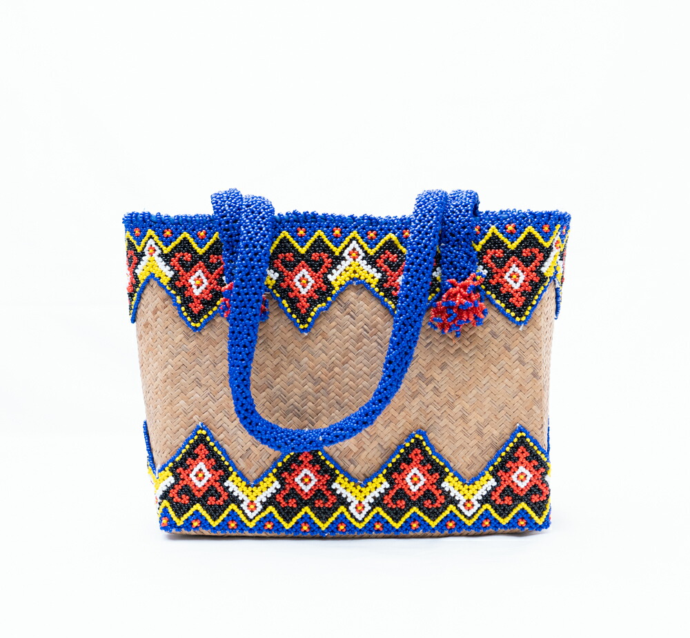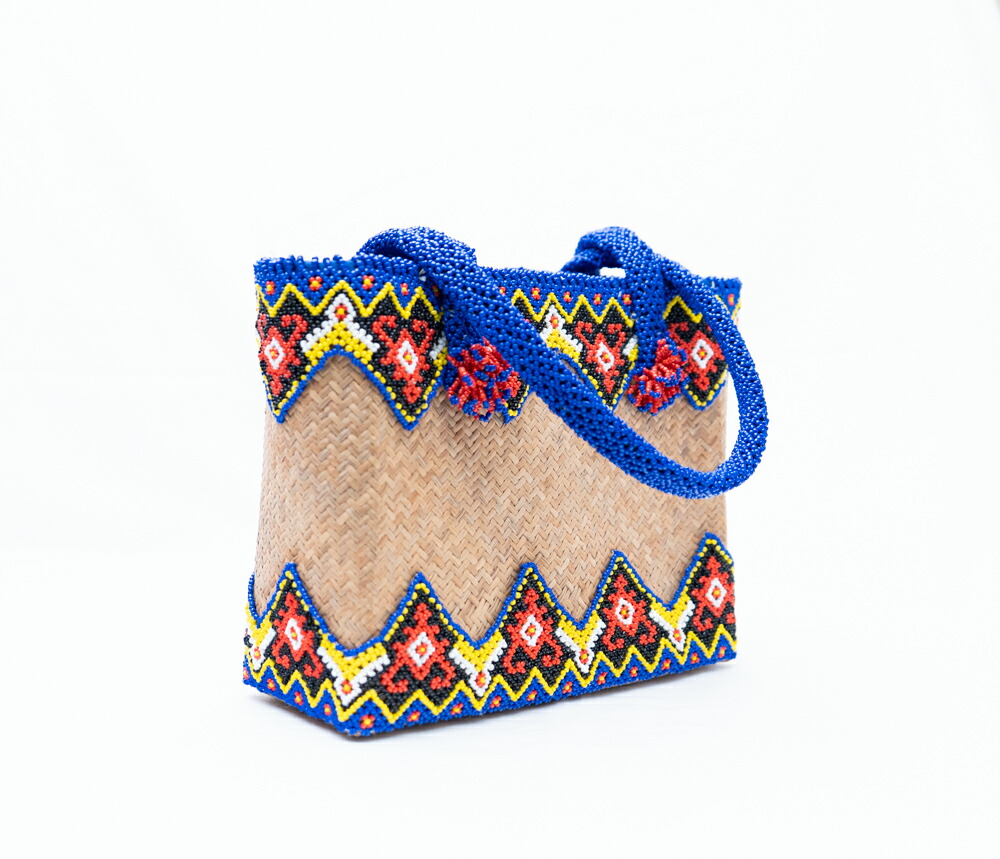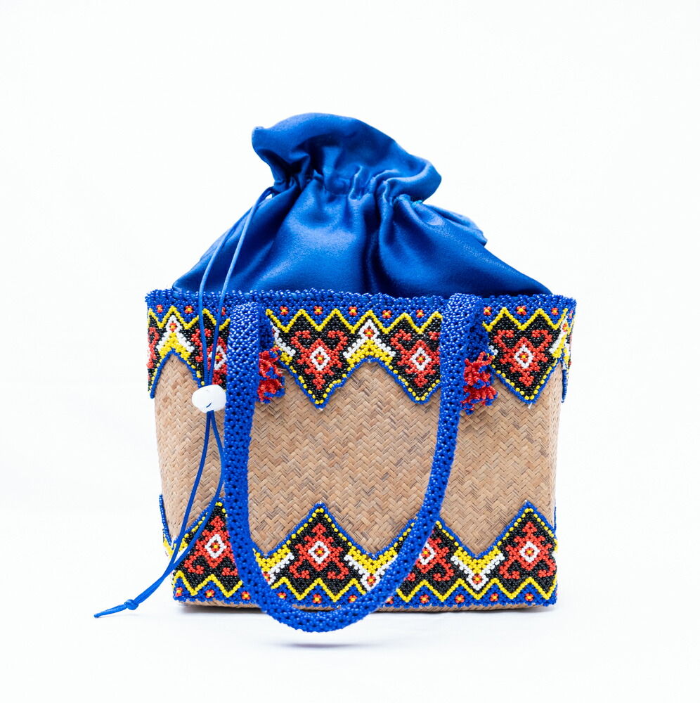 【爽快ブルー】インドネシア ダヤック ビーズ カゴバッグ トートバッグ 青 ラタン 籐 天然素材 手編み 伝統工芸 民族柄 エスニック アジアン雑貨 ビーズワーク 1点もの ハンドメイド ギフト 贈り物 芸術品