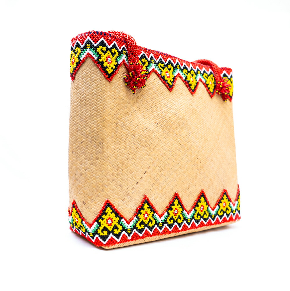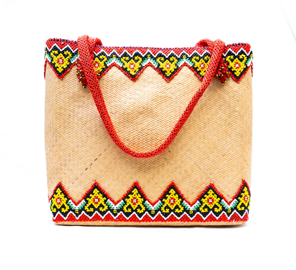 インドネシア ダヤック ビーズ カゴバッグ トートバッグ ラタン 籐 天然素材 手編み 民族柄 エスニック アジアン雑貨 ビーズワーク 幾何学模様 おしゃれ 個性的 A4収納 1点もの ハンドメイド ギフト 贈り物
