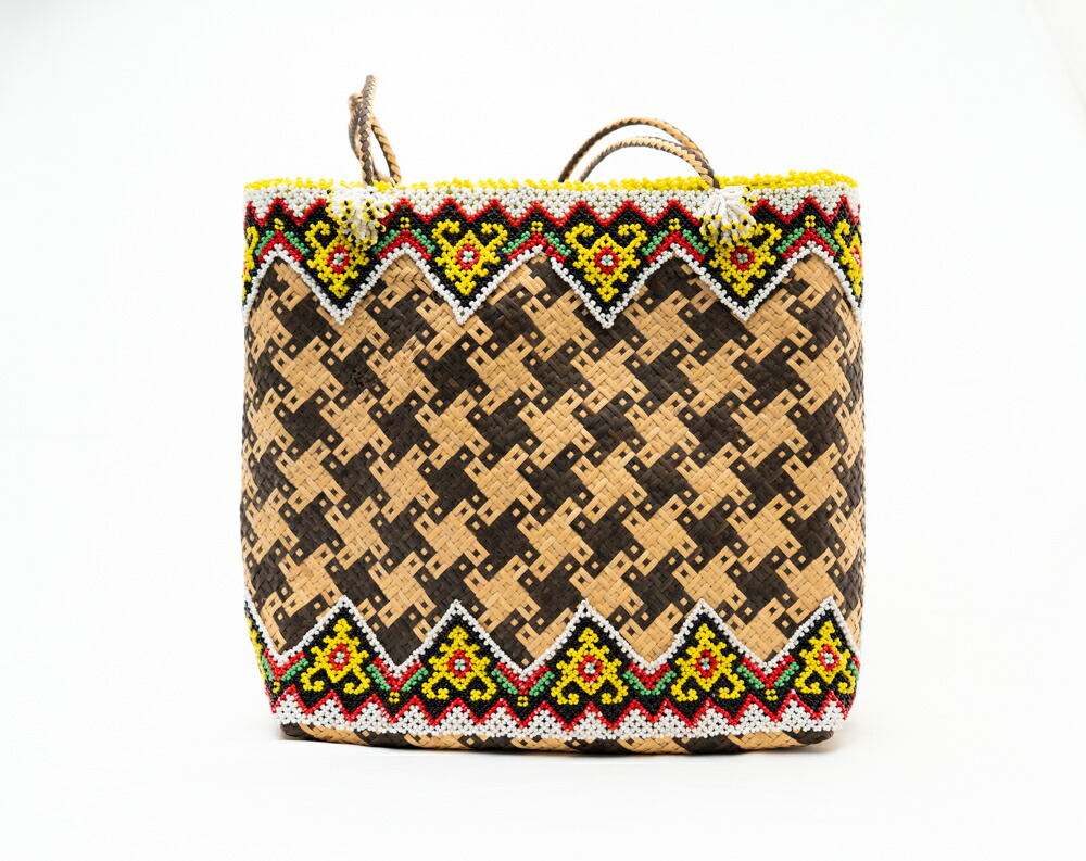 インドネシア ダヤック ビーズ カゴバッグ トートバッグ ラタン 籐 天然素材 手編み 伝統工芸 民族柄 エスニック アジアン雑貨 幾何学模様 おしゃれ 個性的 大きめ A4収納 1点もの ギフト 贈り物