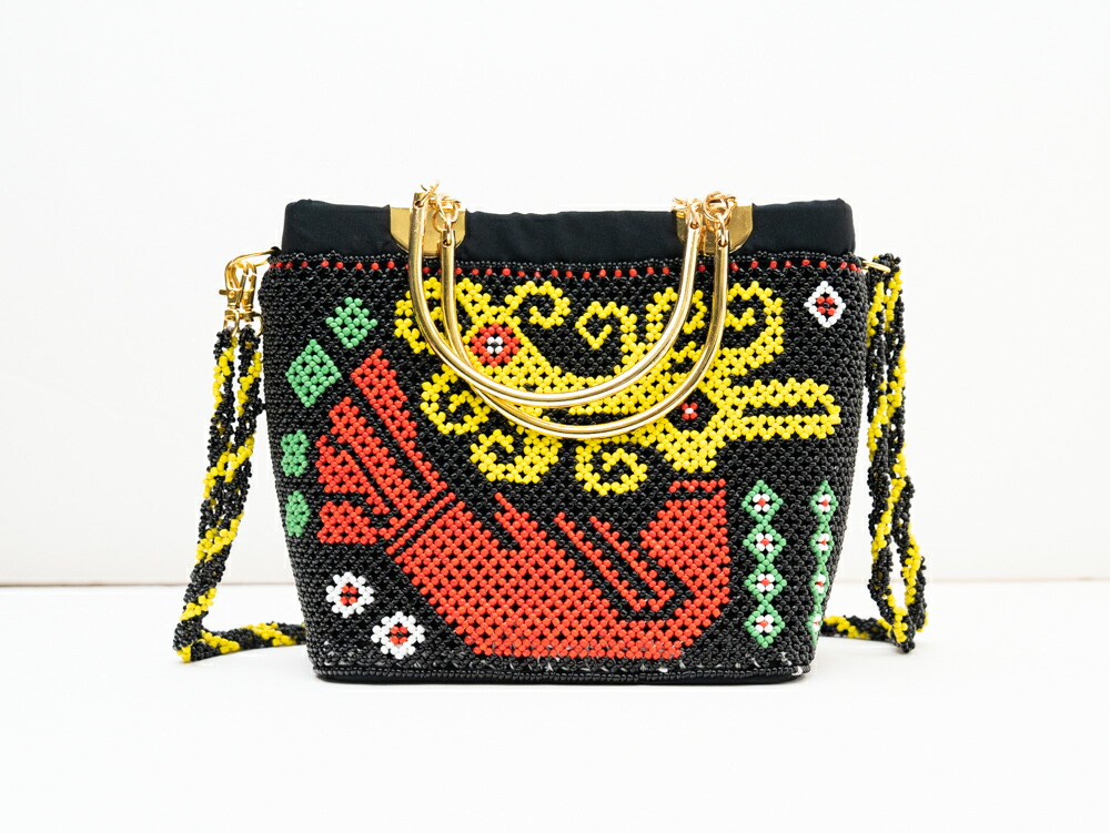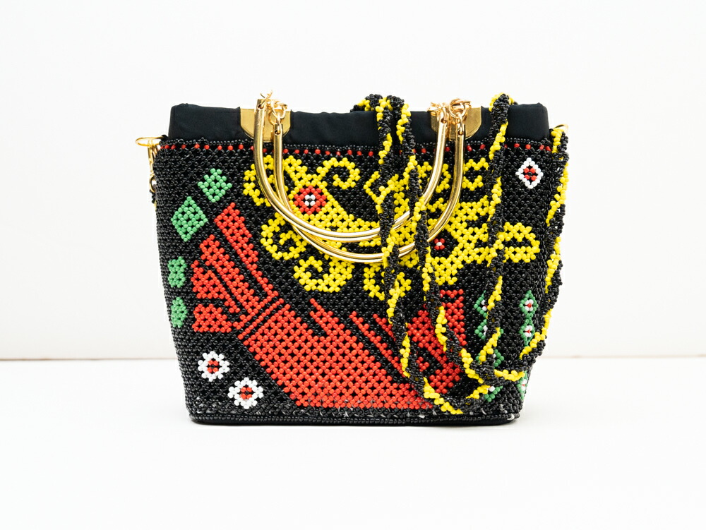 ダヤック・ビーズバッグ M。インドネシア、カリマンタン島に伝わる先住民族「ダヤック族」の伝統的なビーズワーク。熟練の職人が、小さなビーズを一粒ずつ糸に通し、膨大な時間をかけて編み上げた一点ものです。