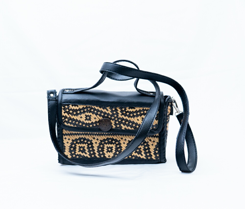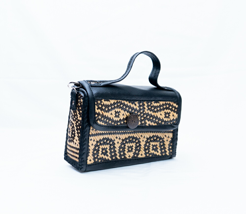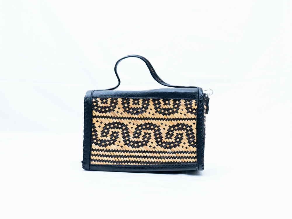 インドネシアの伝統工芸技法で丁寧に手編みされたラタンミニバッグです。シックなブラックカラーに幾何学模様が浮かび上がり、モダンエスニックの魅力を引き立てます。